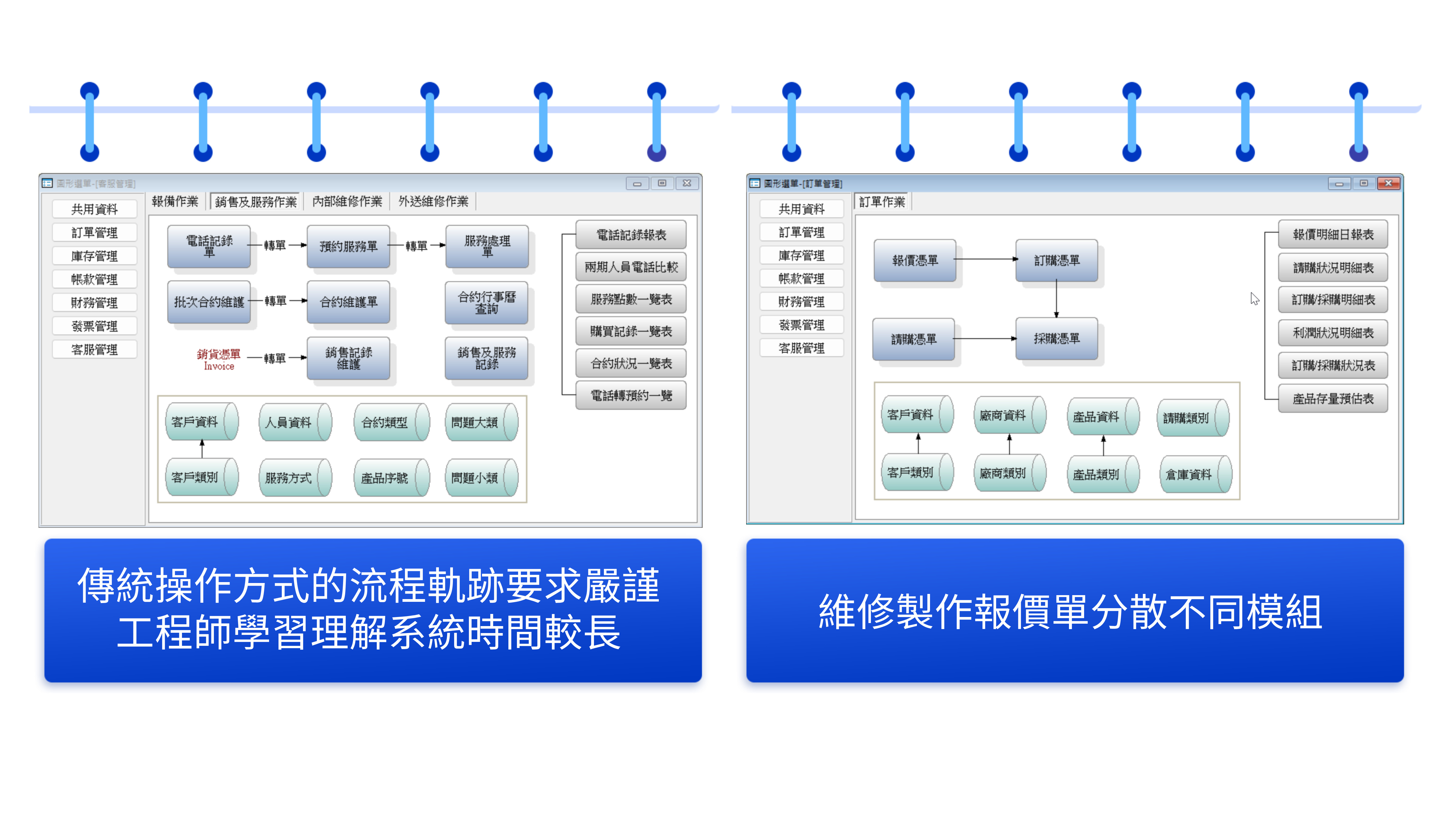 針對這些實際遇到的問題,我們評估後發現,傳統ERP系統難以因應客戶的特殊需求做大幅度的彈性調整。
