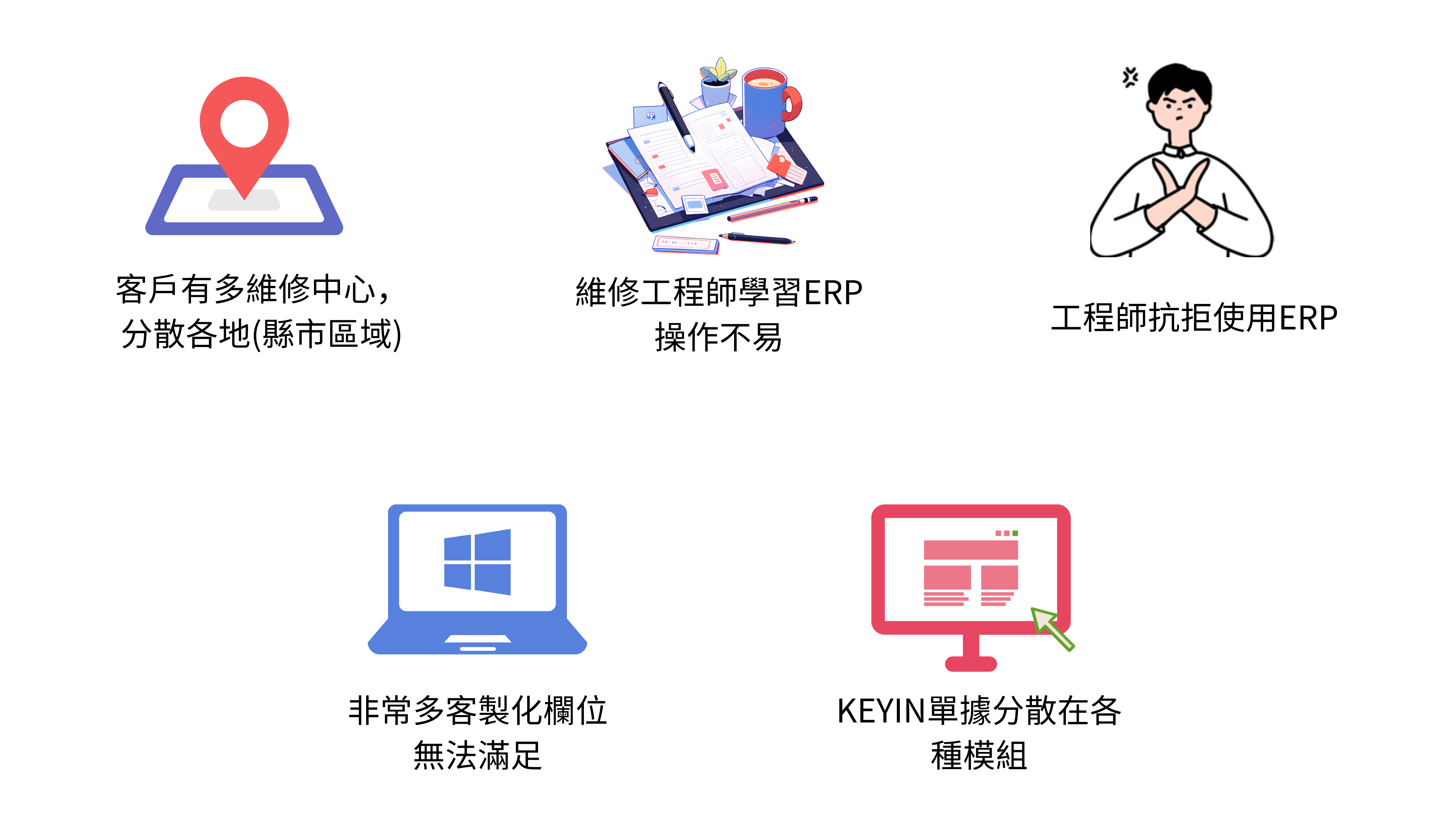 客戶是維修服務業者,在各縣市都有維修據點。當商品需要維修時,工程師需要把維修資訊紀錄到系統裡,各據點的資料需即時同步。但由於ERP系統操作比較複雜,學習成本高,傳統ERP在處理維修報價單時功能分散,涉及多個模組,且客製欄位有限,無法準確紀錄維修資訊,導致工程師對ERP系統較排斥,系統推行一度卡關。